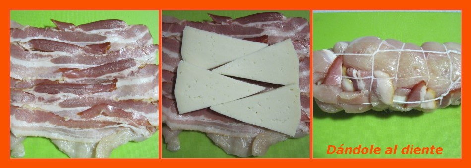 Cogemos una pechuga, la abrimos y salpimentamos. Disponemos las lonchar de bacon y los trozos de queso sobre ella.